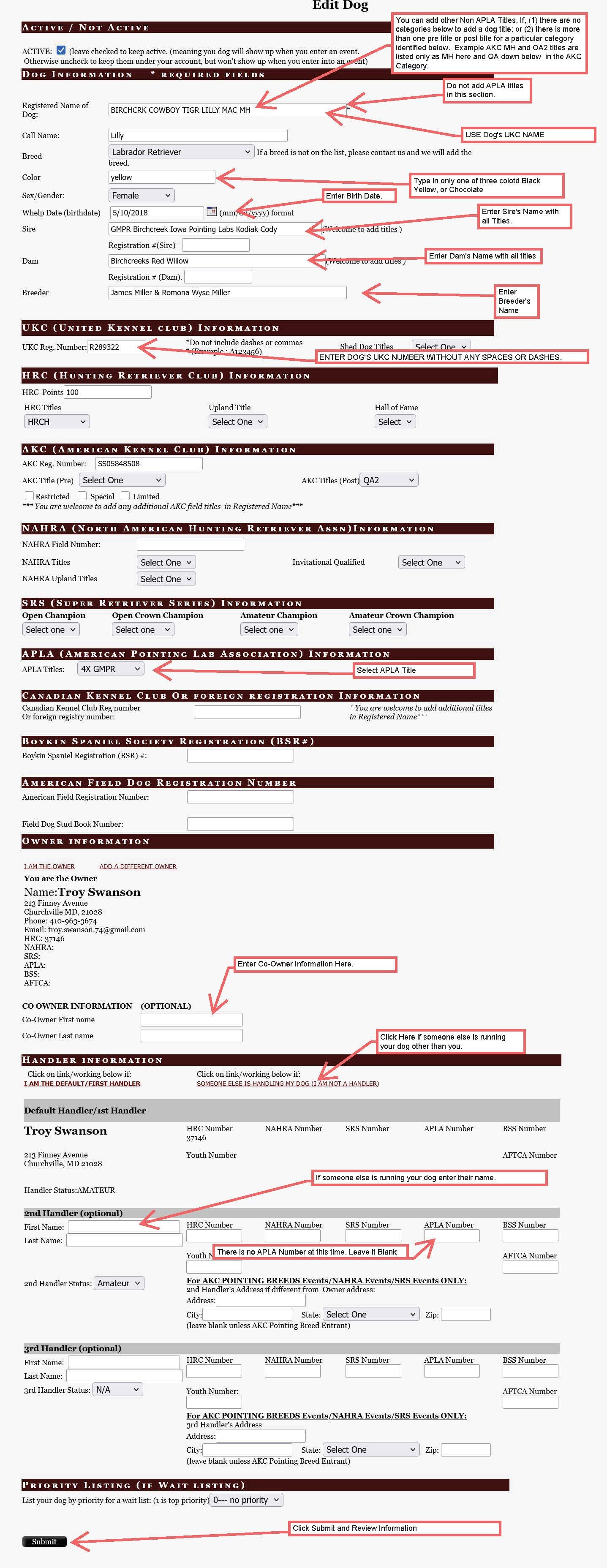 If this information is incorrect or omitted it causes delays in your receiving certificates and results in inaccurate information being recorded in the APLA Dog Database and with the UKC.
